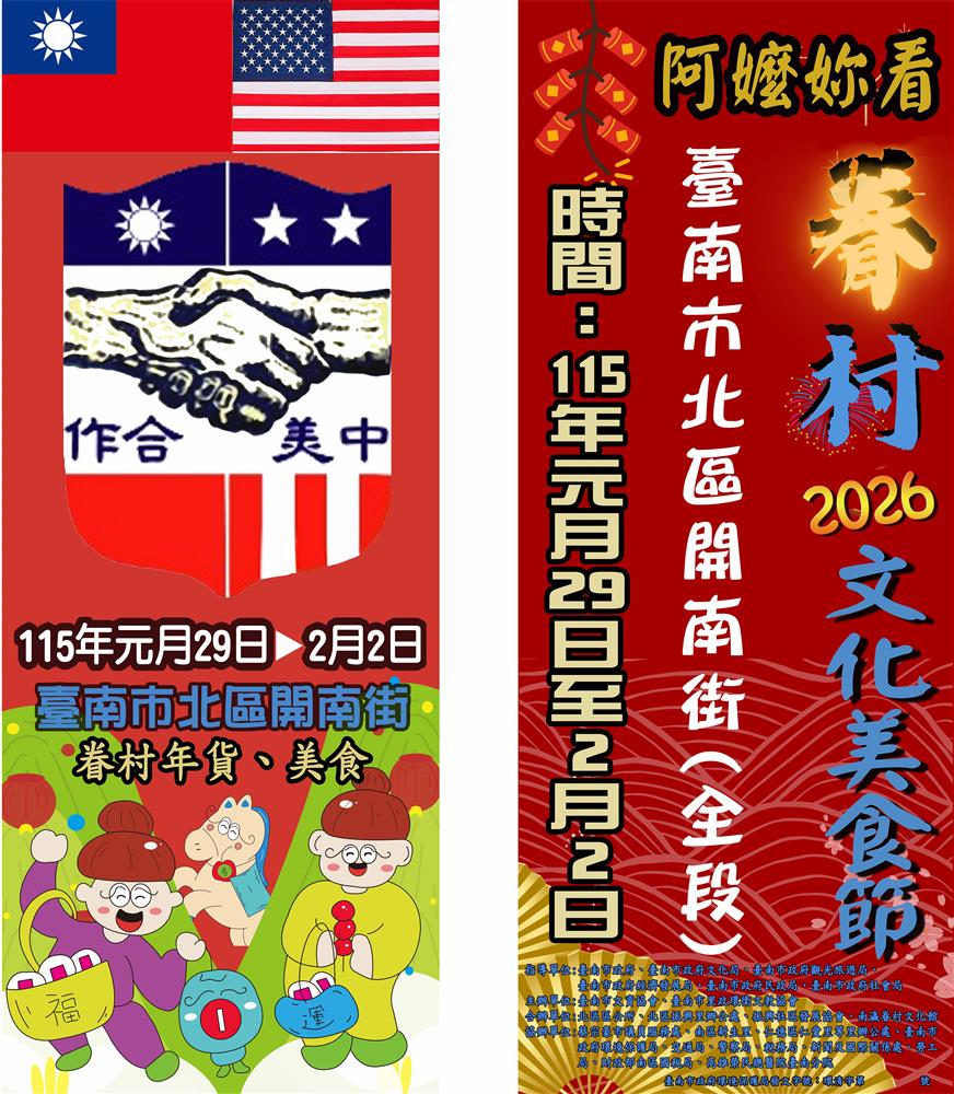 由台南市議員蔡宗豪攜手南瀛眷村文化館、北區區公所、南區新生里,以及振興里暨發展協會跟各個眷村,一同辦理的「2026臺南市北區年貨大街-阿嬤妳看眷村文化美食節」,即將在1月29日到2月2日,於台南市北區開南街盛大舉行。主辦單位表示,為延續眷村文化,這次市集活動特地選在北區原美國學校舊址舉行,因為台南北區是眷村的重要聚落,具有特殊的意義,而這次活動以「熱情、溫馨、包容、關懷」為主軸,除了邀集各眷村美食店家出席以外,也邀請應景的年貨攤商共同參與。此外,活動期間除了規畫眷村市集和精彩的音樂演出外,同時還有摸彩、滿額送贈品,以及打卡分享送眷村肉包等等內容,希望藉此傳承充滿人情味的眷村文化,並將眷村美食分享給更多人。阿嬤妳看眷村文化美食年貨大街,就在1月29日到2月2日熱鬧登場,營業時間從早上九點到晚上九點,除了有年貨市集以外,還安排許多音樂演出以及公益犬貓認養的活動,同時還跟就業服務中心配合,現場替有求職需求的民眾媒合工作機會,也鼓勵各地區的民眾能夠踴躍參加。