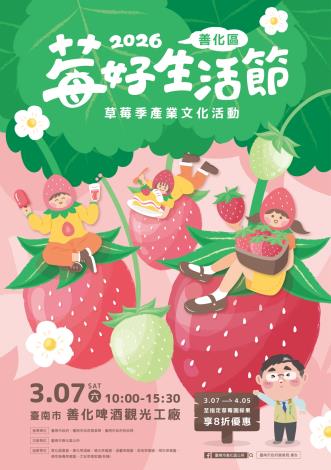 2026台南善化草莓季「莓好生活節」,集將於3月7日上午10點到下午3點30分,於善化啤酒廠熱鬧登場,並一路持續到4月5日,長達一個月。台南市邀請全國民眾走進善化,體驗春日限定的香甜滋味。