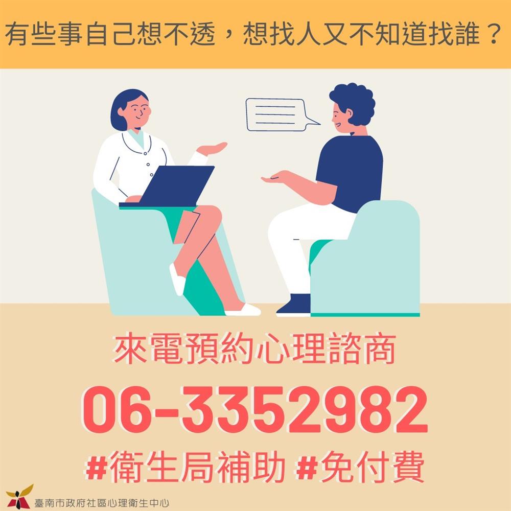 目前臺南市政府衛生局已成立鹽水區、北區、善化區、關廟區及安南區社區心理衛生中心,若有立即傾訴需求,可直撥衛生福利部24小時免費安心專線1925(依舊愛我);此外,更推出「臺南市政府社區心理衛生中心」官方Line帳號,提供市民朋友心理健康檢測。