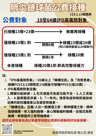 公費接種對象包括:65歲以上長者、55至64歲原住民,以及19至64歲高風險族群(如免疫功能不全、脾臟功能缺損、器官移植等)。接種原則為未曾接種者接種1劑PCV20;曾接種13價或23價疫苗者,須間隔滿1年後再接種PCV20;已完成13價及23價疫苗接種者,無須重複施打。