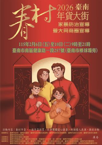 南區區公所指出,本次年貨大街結合文化展演與在地創意,不僅匯集多樣化的眷村年菜、特色小吃與應景年貨,現場也安排多項精彩演出,邀請在地學校與藝文團隊共襄盛舉。而南區眷村年貨大街活動時間,為1月29日到2月2日在水交社眷村文化園區登場,以及2月6日到2月10日在臺南市棒球場旁盛大舉行。